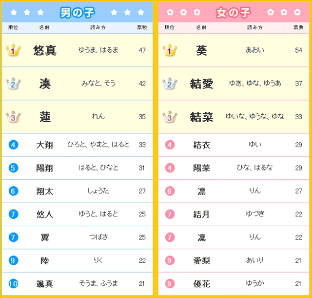 12年赤ちゃんの名前ランキング 男の子 悠真 女の子 結愛 が1位 ベネッセ教育情報サイト